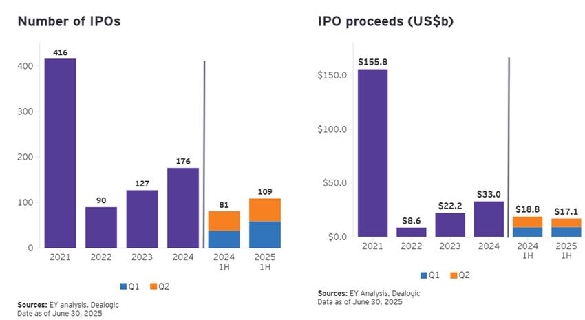 EY Americas есебіне сәйкес, 2025 жылдың екінші тоқсанында АҚШ-тағы IPO саны 2024 жылдың екінші тоқсанымен салыстырғанда 16%-ға өсті, жалпы түсімдер әлсіз болғанына қарамастан.