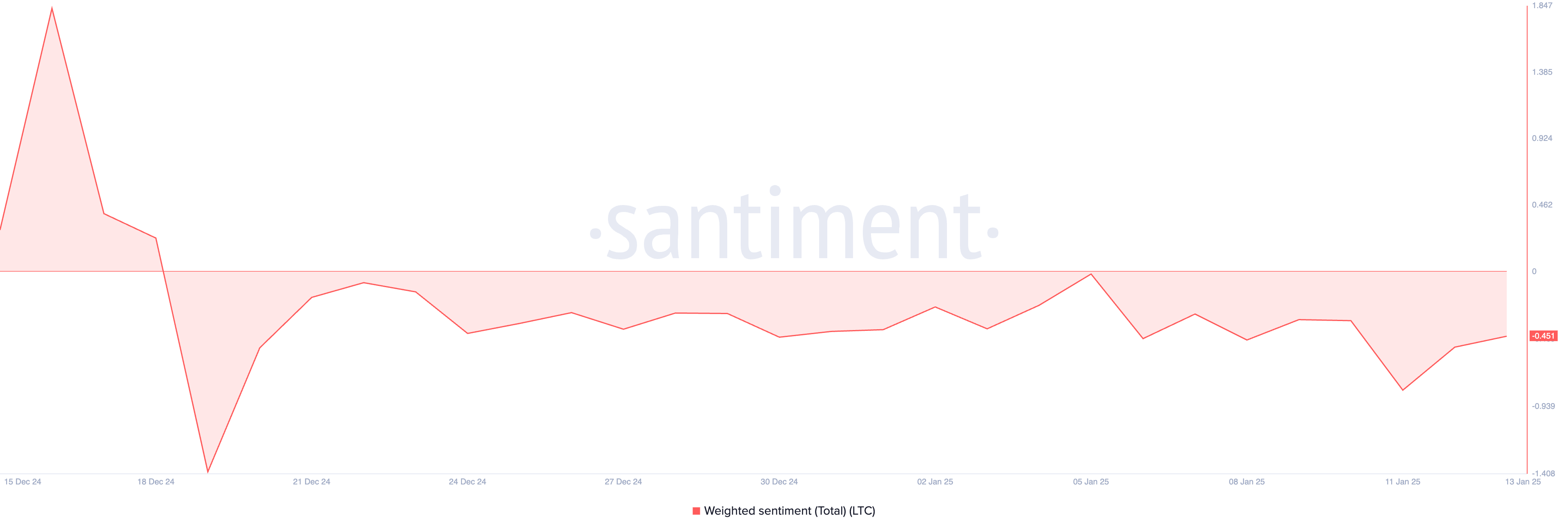 Желідегі белсенділіктің бұл төмендеуіне қоса, LTC-нің салмақталған көңіл-күйі де теріс болып қалды, бұл оның бағасына төмендеу қысымын қосады. Бұл жазу кезінде бұл -0,45.