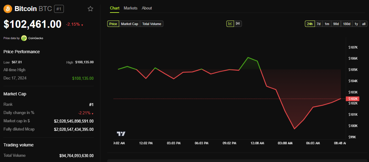 BeInCrypto деректері бойынша көрсетеді, бұл жазу кезінде Bitcoin 102 461 доллар үшін сатылып жатты, дүйсенбі сессиясы ашылғаннан бері 2,15% төмендеді.