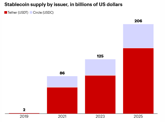 Бұл графикте стейблкоин нарығындағы Tether-дің үстемдігі көрсетілген, жалпы ұсыныс соңғы жылдары 2 млрд доллардан 200 млрд доллардан астамға дейін өсті.
