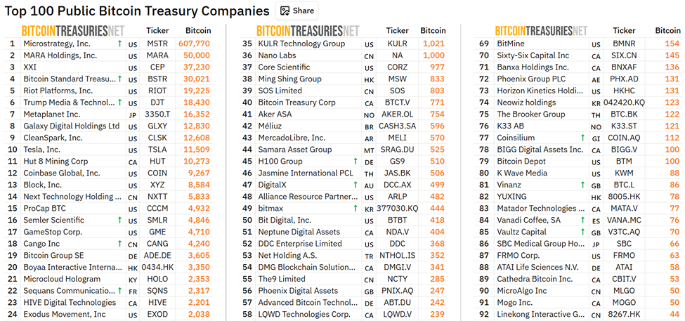 Bitcoin Treasuries деректері MARA-ның BTC-нің қоғамдық корпоративтік иелері арасында 50 000 токенмен екінші орында екенін көрсетеді.