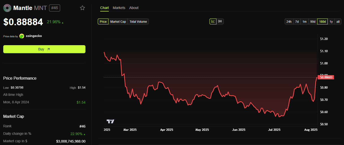 Бұл ETH бөлуімен Mantle қазір Web3 субъектілері арасында ең ірі ETH иелерінің бірі болып табылады, SΞR көшбасшылар тақтасында 8-ші орынға ие. Сонымен қатар, ETH бағасы шілде айының ортасынан бастап 3 000 доллардан 4 000 долларға дейін өсті. Бұл стратегиялық резерв MNT-ны ETH-мен байланыстырып, бағаны арттырды.