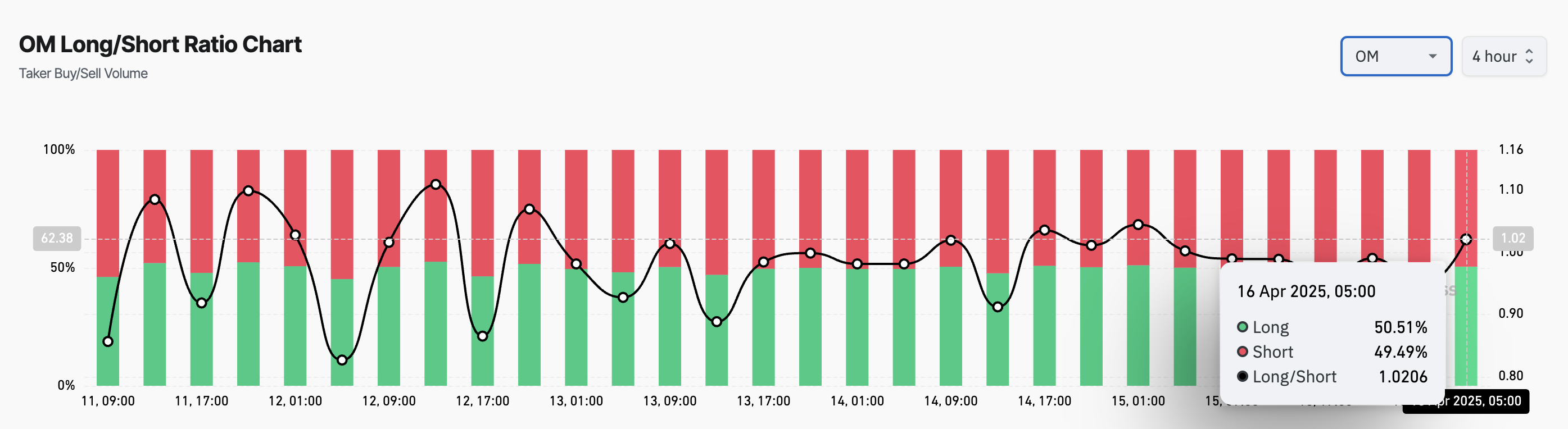 Сонымен қатар, OM-нің ұзақ/қысқа қатынасы мұны растайды. Бұл жазу кезінде, ол 1,02-ге тең, фьючерс трейдерлері арасында ұзақ позицияларға деген артықшылықты көрсетеді.