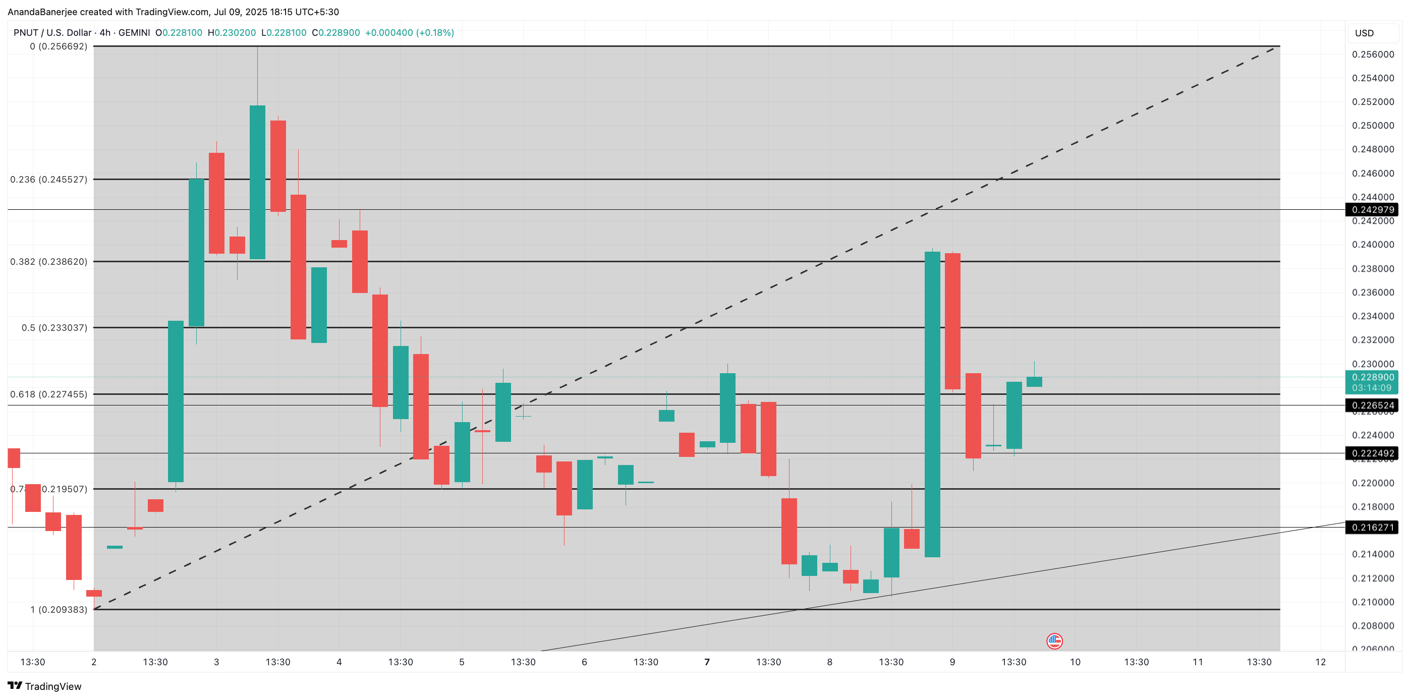 Алдыңғы төменнен жоғарыға дейінгі (3 шілде) Фибоначчи кері қайтару көрсеткендей, PNUT бағасы $0,2386 деңгейіндегі 0,382 Фиб деңгейін қайта сынады, оны уақытша бұзғаннан кейін. Бұл аймақ, сондай-ақ $0,245 және $0,256, дағдарыстық қарсылық деңгейлері болып қалады. PNUT бағасы қазір $0,22-ге жақын және бұқа трендін қайта қалпына келтіруде қиындықтарға тап болуда.