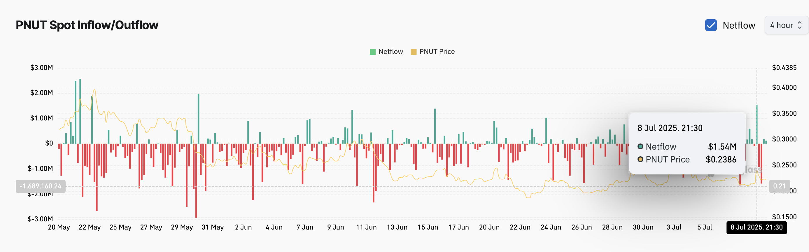 8 шілдеде биржа нетфлоулары оңға ауысып, 1,54 млн доллар көлеміндегі PNUT биржаларға ауысты, бұл трейдерлердің сатуға дайындалғанын көрсетеді.