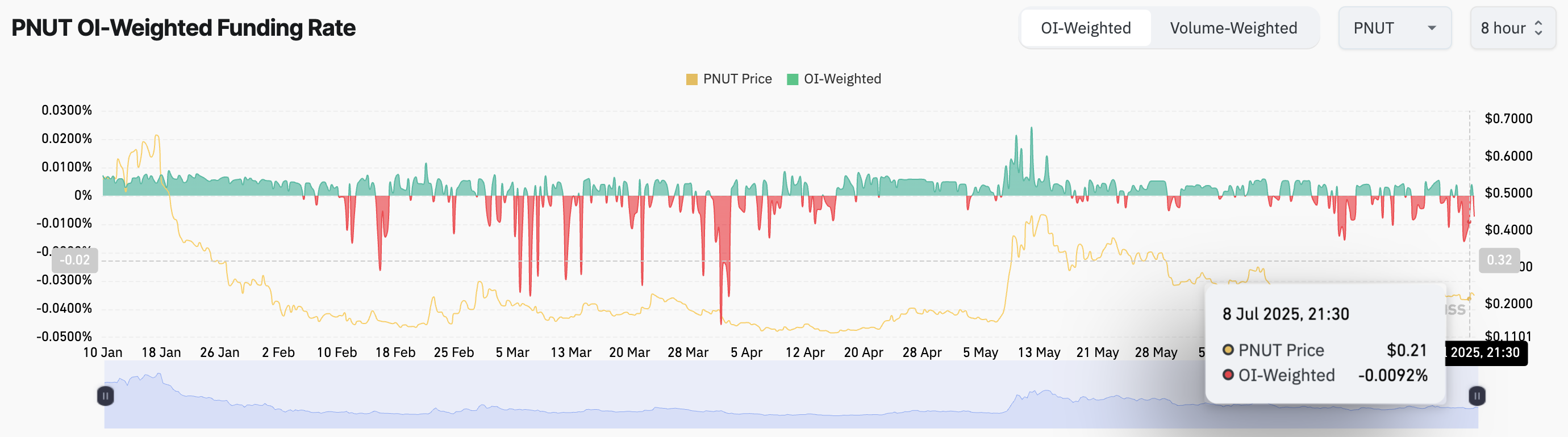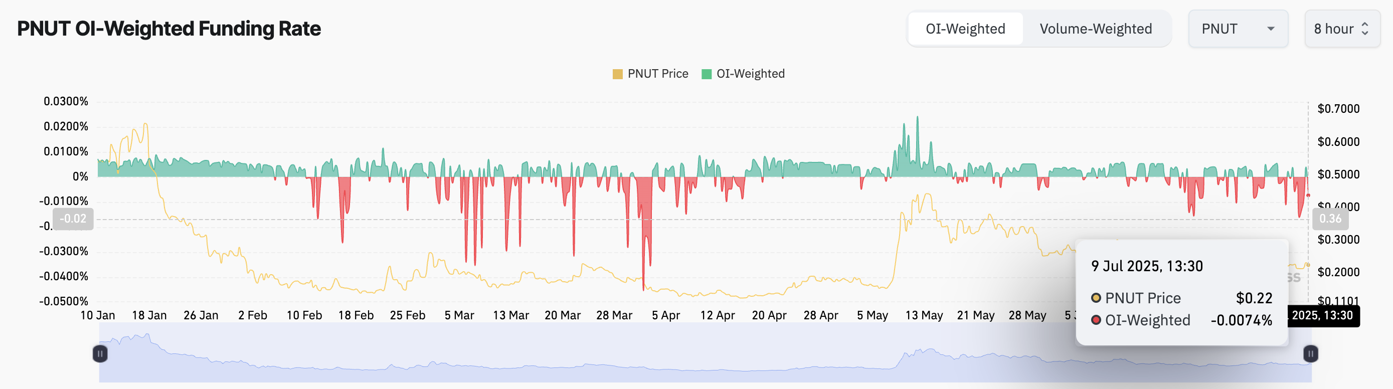 Көп күндер бойы PNUT үшін қаржыландыру мөлшерлемесі теріс болып қалды, бұл трейдерлердің бағаның төмендеуіне бәс тіккенін көрсетті. Бірақ 8 шілдедегі Масктың твитінен кейін бұл өзгерді. Мөлшерлеме нөлге жақындап, 9 шілдеде -0,0074%-ға жетті.