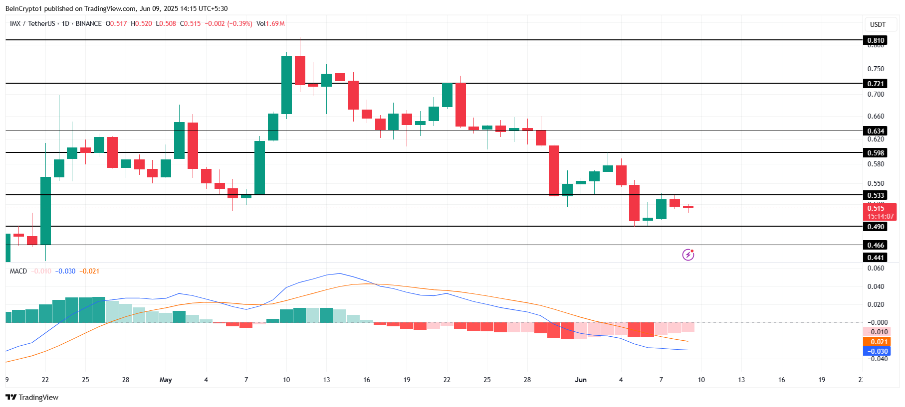 Алайда, MACD аю импульсінің әлі де белсенді екенін көрсетеді, бұл IMX-тің қалпына келуіне кедергі келтіруі мүмкін. Егер сату қысымы сақталып, кез келген бұқа импульсінен басым болса, IMX 0,49 доллар қолдауынан төмен түсуі ықтимал. 0,46 долларға дейін төмендеу бұқа тезисін жоққа шығарып, төмендеу үрдісінің жалғасуын білдіреді.