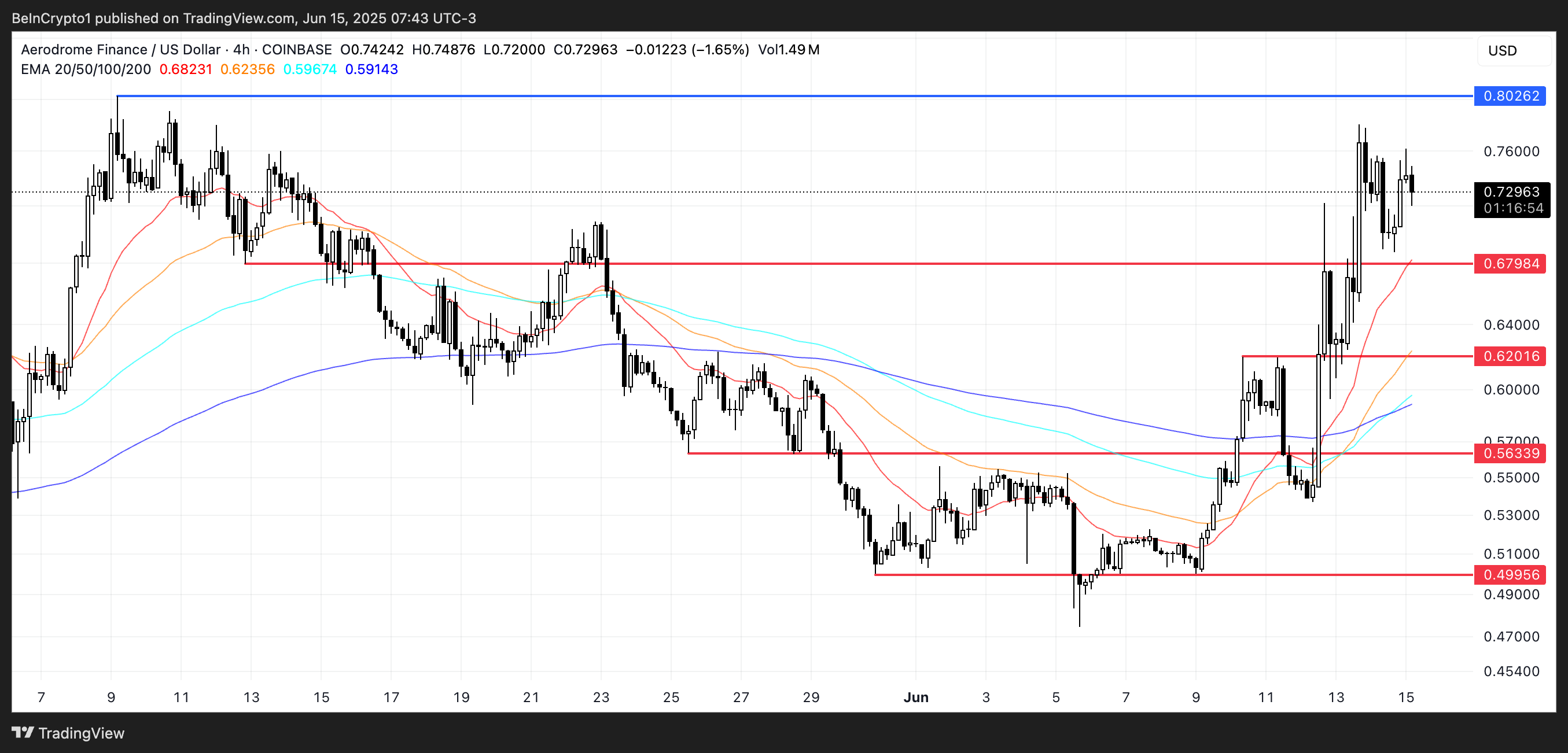 Техникалық тұрғыдан алғанда, AERO қазір 0,80 доллардағы дағдарыстық қарсылық деңгейіне жақындап келеді. Егер бұл деңгей бұзылса, импульс бағаны тез арада 0,90 долларға қарай жылжытуы мүмкін.