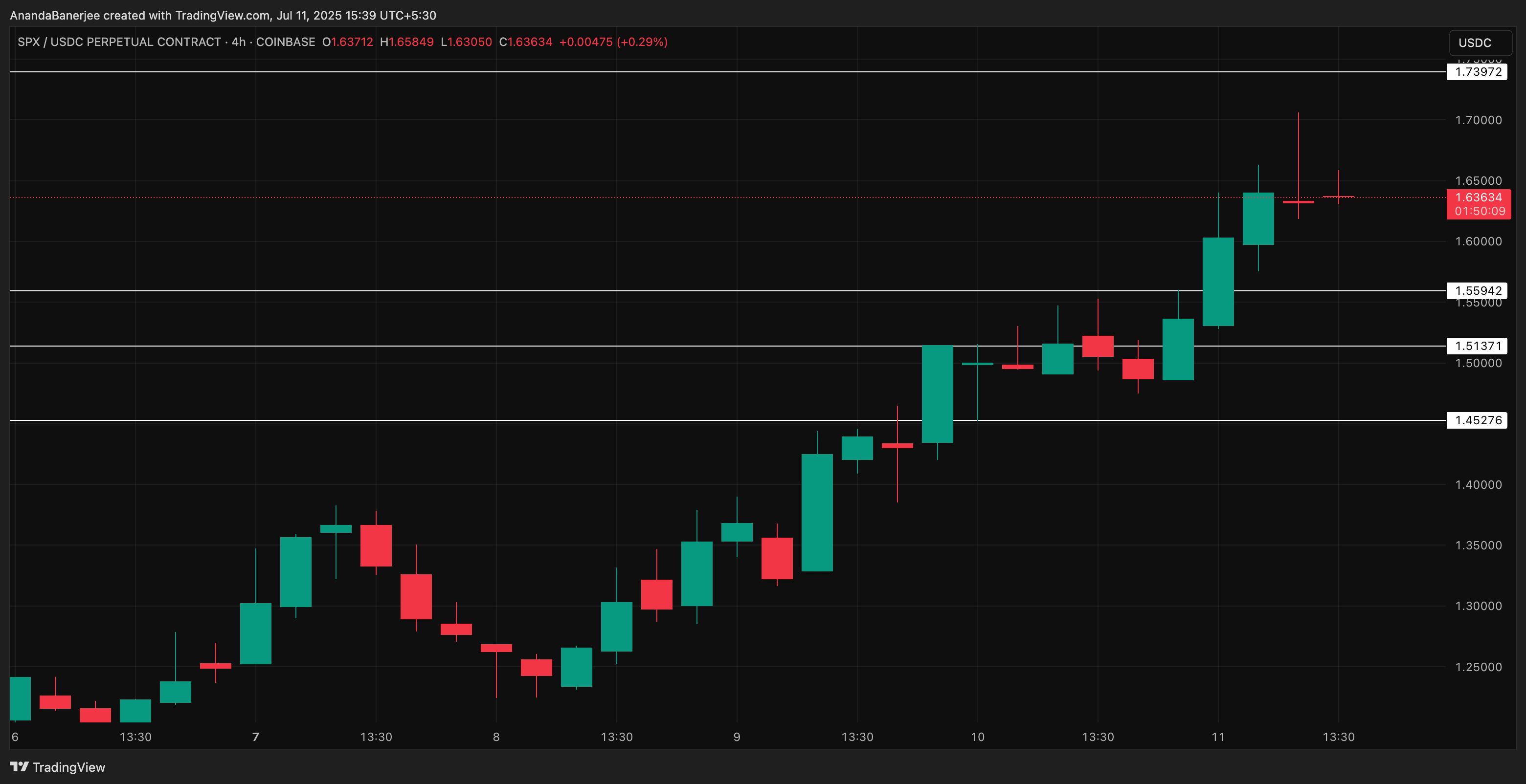Токен қазіргі уақытта 1,67 доллардан саудалануда, бұл оның тарихи максимумы 1,74 доллардан небәрі 1,7%-ға төмен — бұл деңгей алты айдан астам уақыт бойы байқалмаған. Маңыздысы, SPX қазірдің өзінде 1,55 долларды қолдауға айналдырды, бұл раллидің тек реакциялық емес екенін, оның артында құрылым бар екенін көрсетеді.