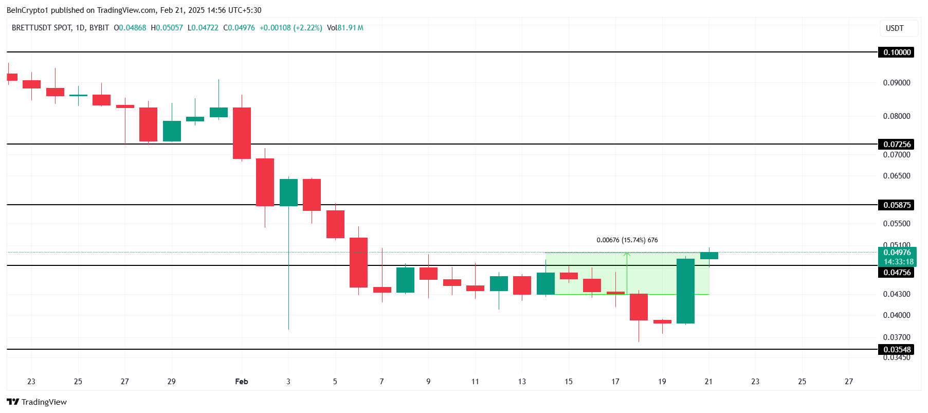 BRETT, ең үздік мемкоиндардың бірі, кеңірек нарық трендтеріне қарсы шығып, 15,7% өсіп, 0,049 доллар деңгейінде саудалануда. Бұл өсу альткоин үшін оң өзгерісті білдіреді, егер қолайлы жағдайлар сақталса, ол импульсті жалғастыруы мүмкін екенін көрсетеді.