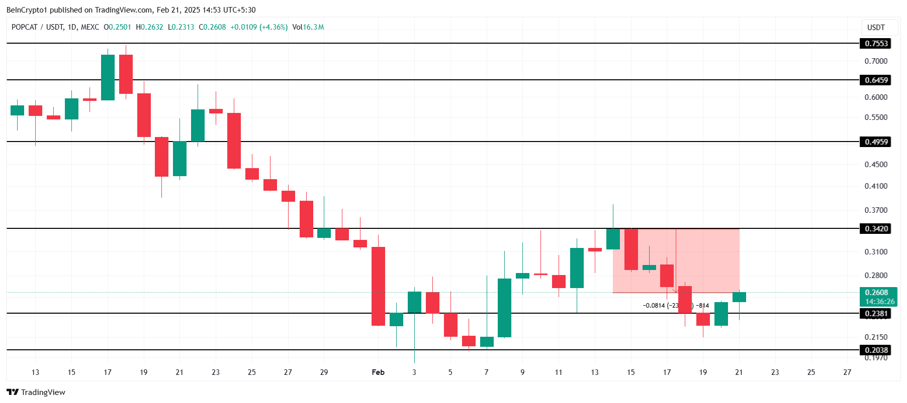 POPCAT бағасы соңғы жеті күнде 23% төмендеп, 0,26 доллар деңгейінде саудалануда. Соған қарамастан, мемкоин 0,23 долларды қолдау деңгейі ретінде қалпына келтіре алды. Бұл қалпына келтіру әлі де белгісіз, және POPCAT жоғалған жерді қалпына келтіруге және қайта көтерілуге тырысқан кезде белгісіздікке тап болады.