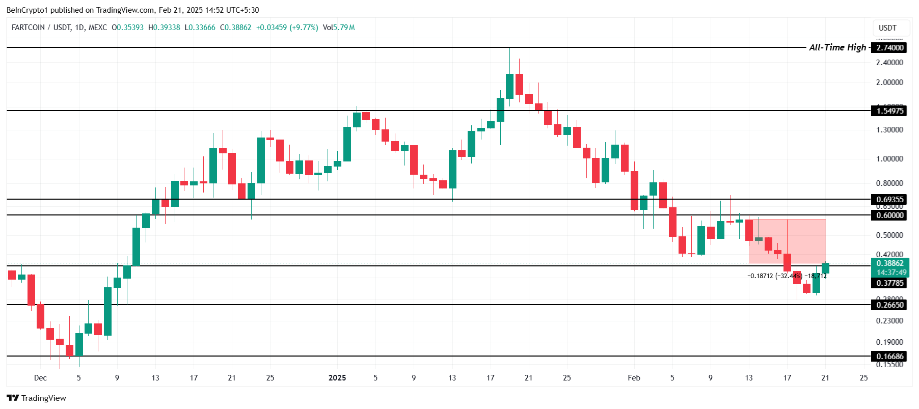 Алайда, егер FARTCOIN 0,37 долларды қолдау деңгейі ретінде сәтті қамтамасыз ете алса, ол 0,60 доллар қарсылыққа қарай көтерілуге жол аша алады. Бұл деңгейді сәтті бұзу аюлы тезисті жоққа шығарып, FARTCOIN-ды 0,69 доллардан жоғарыға жібере алады.
