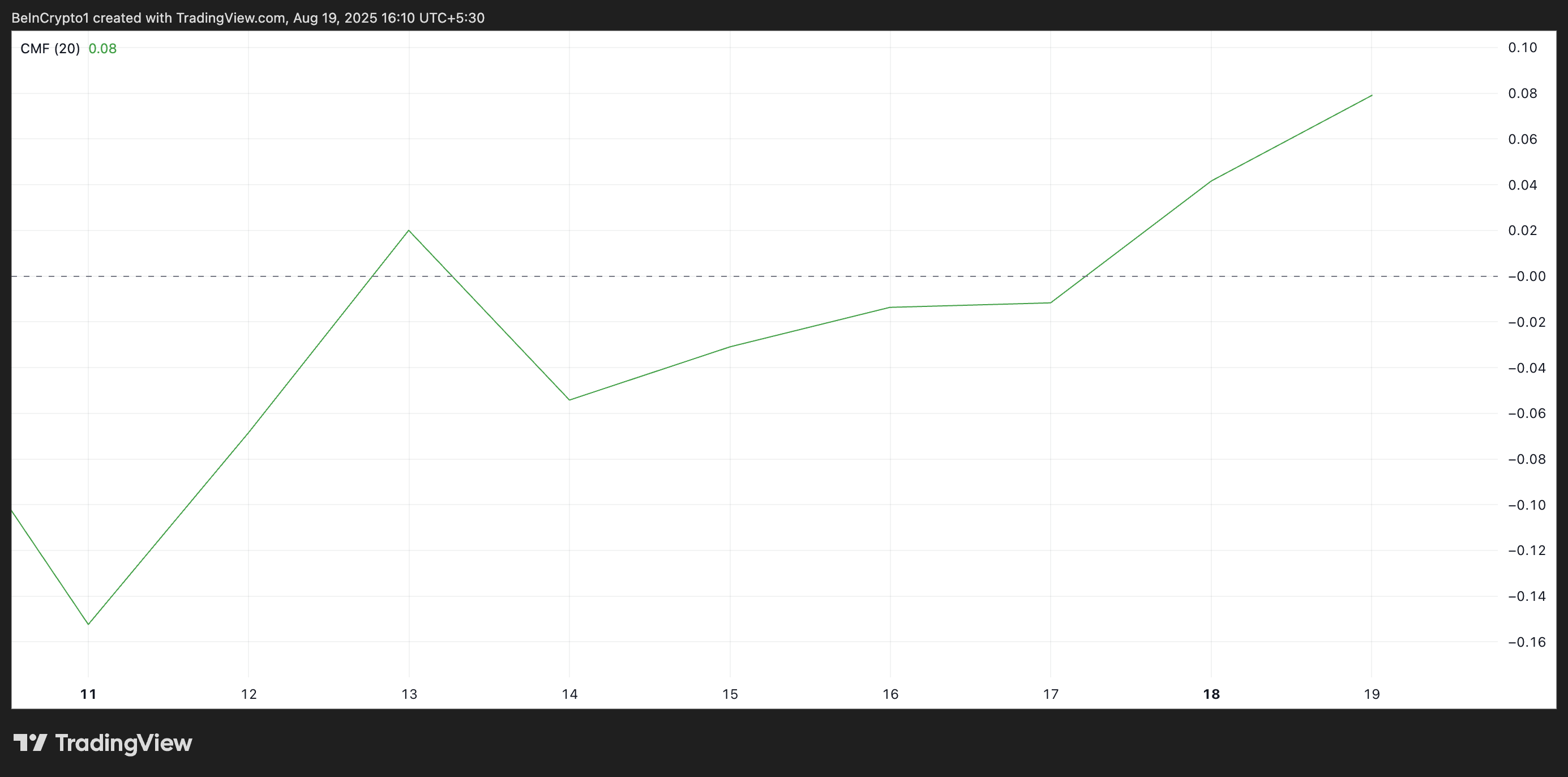 Бұл жазу кезінде, активке ақша ағынын қадағалайтын импульс индикаторы 0,08 деңгейінде және жоғары бағытта тренд көрсетуде. Оң CMF көрсеткіші күшті сатып алу қысымын көрсетіп, инвесторлардың MNT-ге капитал құюды жалғастырып жатқанын көрсетеді.