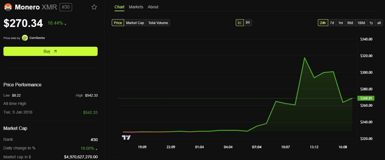 Monero (XMR), құпиялылыққа бағытталған монета, криптовалюта нарығындағы таңғажайып дамуда 330 млн доллар жылыстату мәмілесінен кейін бірнеше сағат ішінде 40%-ға баға өсімін байқады.
