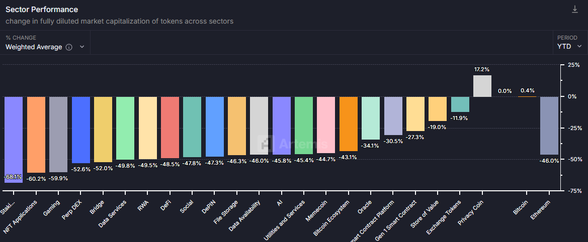 Artemis, криптовалюта аналитика платформасының деректері де айтарлықтай трендті көрсетті. 2025 жылдың басынан бастап, құпиялылыққа бағытталған монеталар сияқты Monero оң өсім көрсеткен жалғыз сектор болып, 17%-дан астам өсімге қол жеткізді.