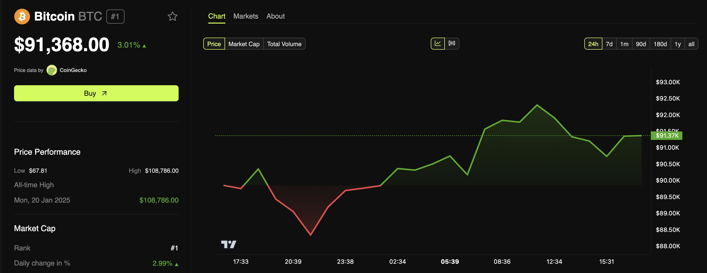 Бұл жоғары қозғалыс бес күн бұрын 80 000 доллардан төмен қысқа мерзімді құлдыраудан кейін болды. Соңғы жаңартуға сәйкес, Bitcoin 91 368 доллардан саудаланып, соңғы 24 сағат ішінде 3,0% өсім көрсетті. Бұл өсімдер тұрақты бұқа раллиіне әкеледі ме, әлде нарық қайтадан құлдырай ма, белгісіз болып қалуда.