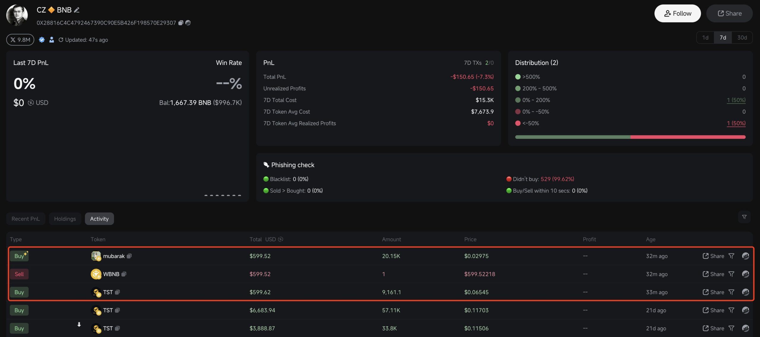 MUBARAK-тың соңғы баға өсуі Binance негізін қалаушы CZ-дің ықпалына байланысты. Lookonchain хабарлауынша, CZ 1 BNB-ді 20 150 MUBARAK-қа айырбастады, сол кезде оның құны 600 доллар болды. Бұл оқиға, токеннің Binance Alpha-да листингімен бірге, ерекше раллиді тұтандырды.