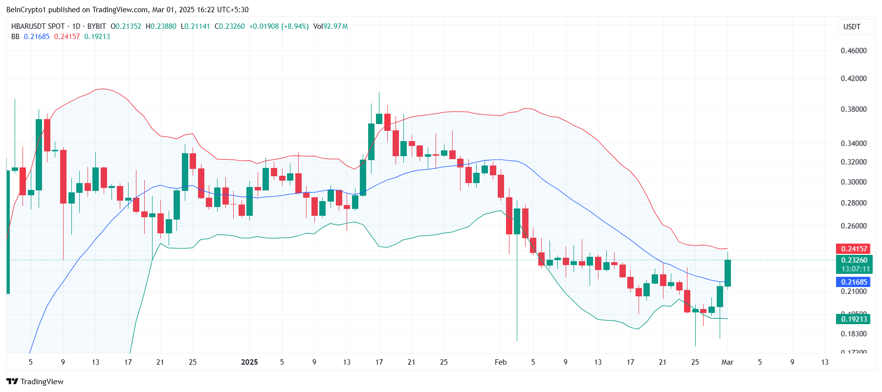 HBAR үшін Боллинджер жолақтары жақында сығылуды көрсетті, бұл құбылмалылықтың ықтимал өсуін білдіреді. Бұл үлгі көбінесе елеулі баға қозғалыстарынан бұрын болады және бұл жағдайда құбылмалылық альткоиннің қалпына келуіне қолайлы болды.