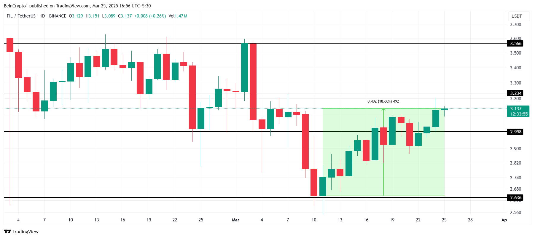 Қазіргі уақытта 3,13 долларда саудаланып жатқан FIL 3,23 доллар дағдарыстық кедергі деңгейінен сәл төмен тұр. Егер альткоин бұл кедергіні қолдауға айналдыра алса, бағаны 3,56 долларға дейін көтеруі мүмкін. Бұл қадам FIL-дің соңғы шығындарын қалпына келтіруге және криптовалюта үшін бұқа көзқарасын нығайтуға көмектеседі.