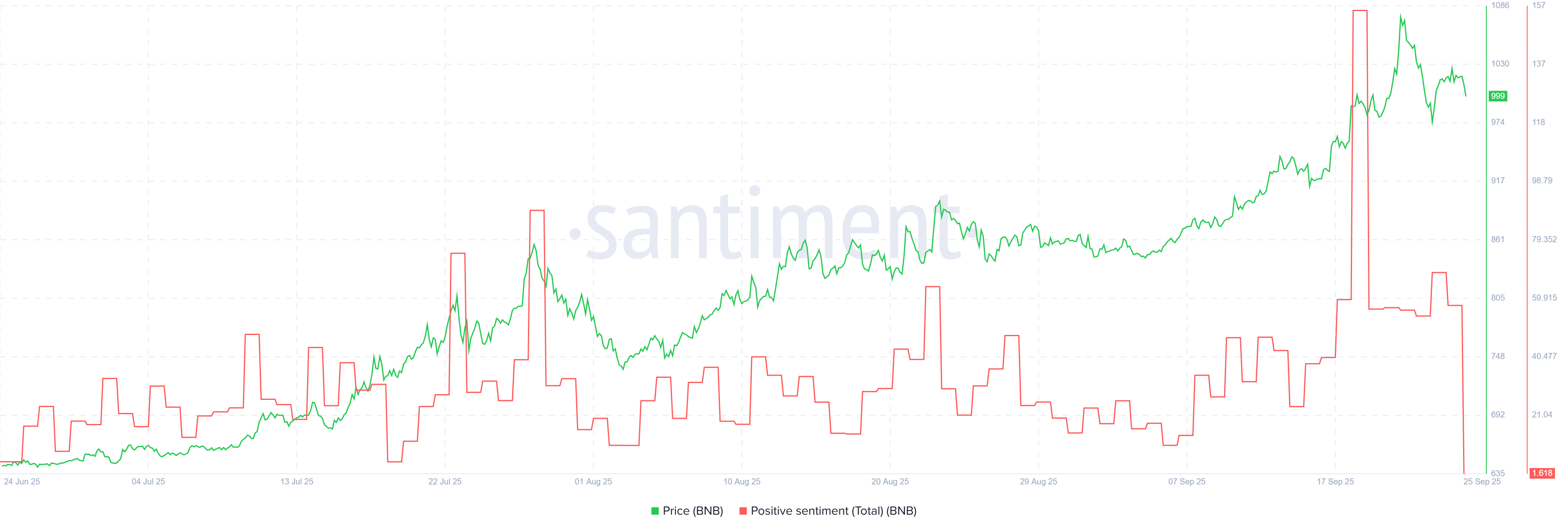 Сонымен қатар, Santiment-тің Оң көңіл-күй деректері трейдерлердің ынтасының төмендегенін көрсетеді. Графикте BNB бағасы (жасыл сызық) өткен аптада 1 080 доллардан асып кеткенін, ал оң көңіл-күй (қызыл сызық) төмендегенін көрсетеді.
