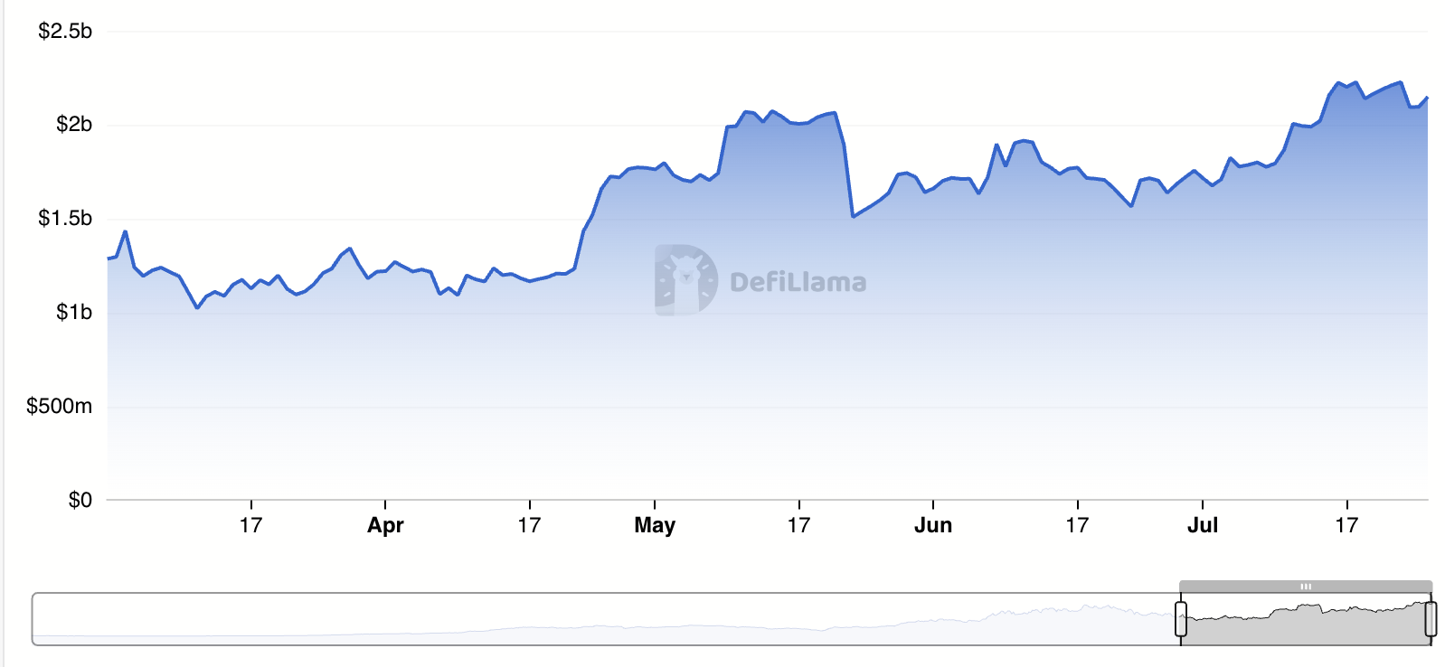 Ол SUI-дің жалпы құлыпталған құнының (TVL) өткен айда өсуі желінің инфрақұрылымына деген қабылдау мен капитал сенімінің артуын білдіретінін қосты. DefiLlama мәліметтері бойынша, бұл қазіргі уақытта 2,148 млрд долларға тең, шілде айының басынан бері 25%-ға өсті.