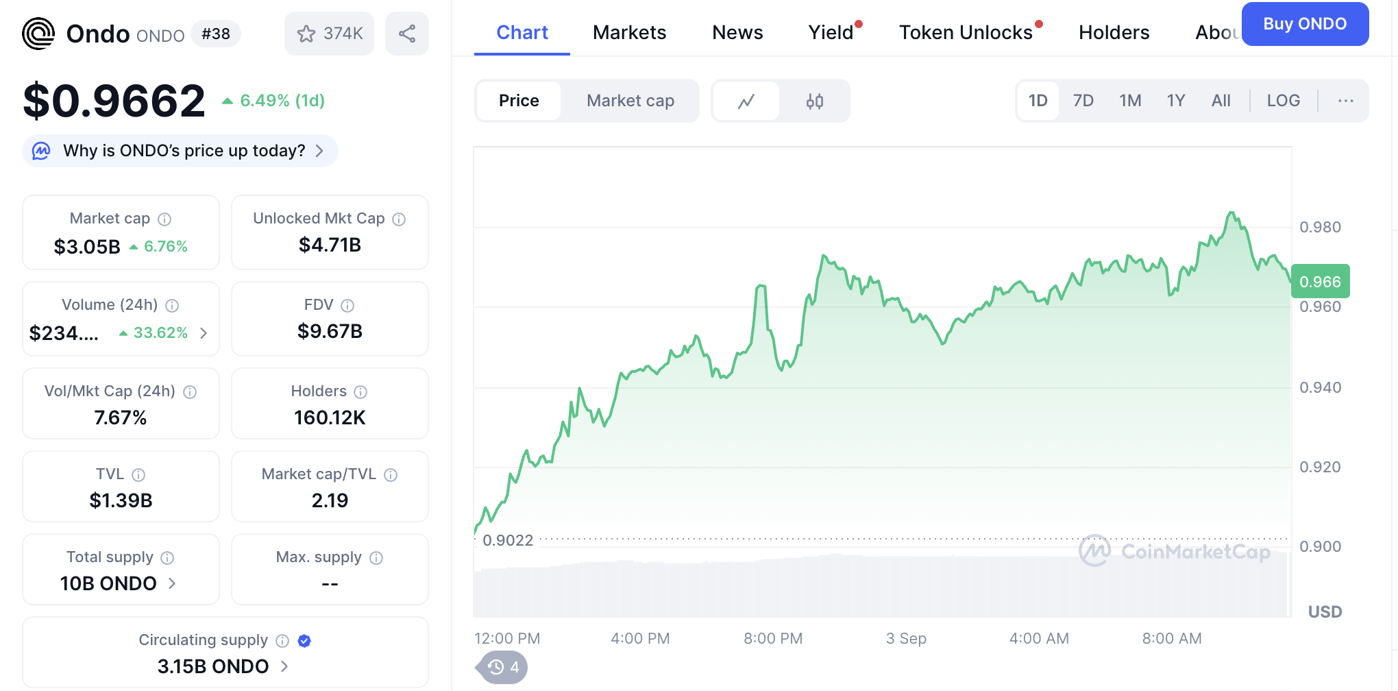 Ondo бүгін өзінің жаңа Global Markets платформасын іске қосты, 100-ден астам АҚШ-та орналасқан акциялар мен ETF-тердің токенделген нұсқаларын ұсына отырып. Фирманың ONDO токені бағада аздап өсіп, іске қосылған кезде көлемі 33%-ға артты.