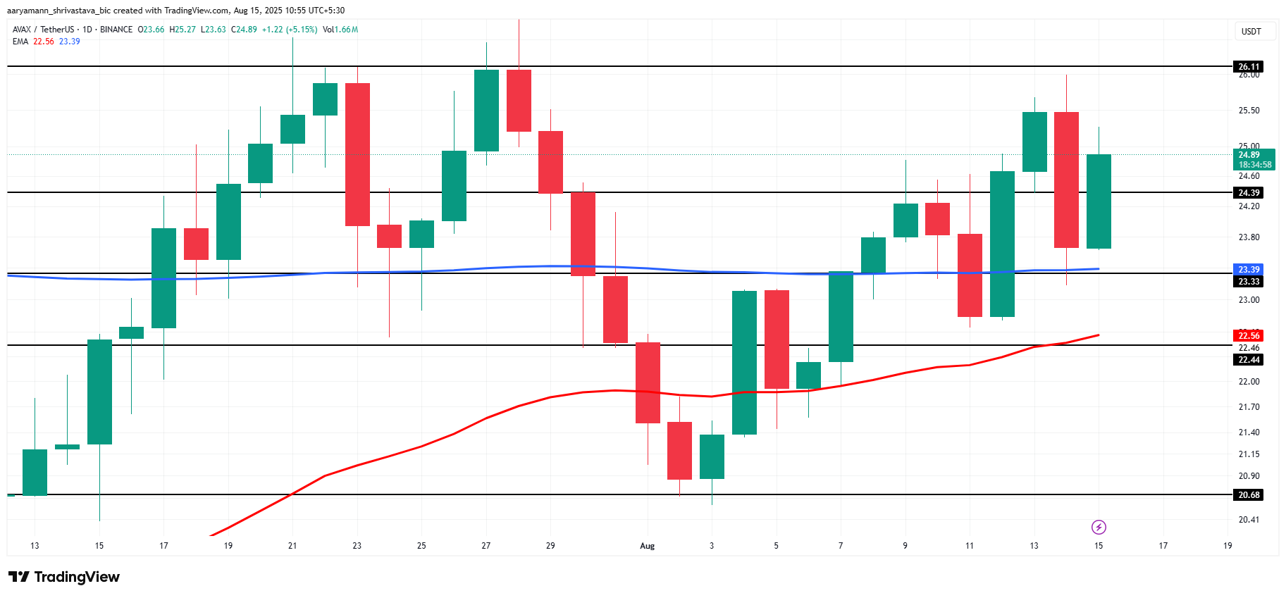 AVAX маңызды 24,39 доллар қолдау деңгейінен жоғары ұстап тұр, 50-күндік EMA 200-күндік EMA-ға жақындап келеді. Алтын Крест формациясы жақындап, бұқа сигналын тудыруы мүмкін. Егер крест орын алса, AVAX бағасы 26,11 долларға немесе одан жоғары көтерілуі мүмкін, өзінің жоғары импульсін жалғастыра отырып.