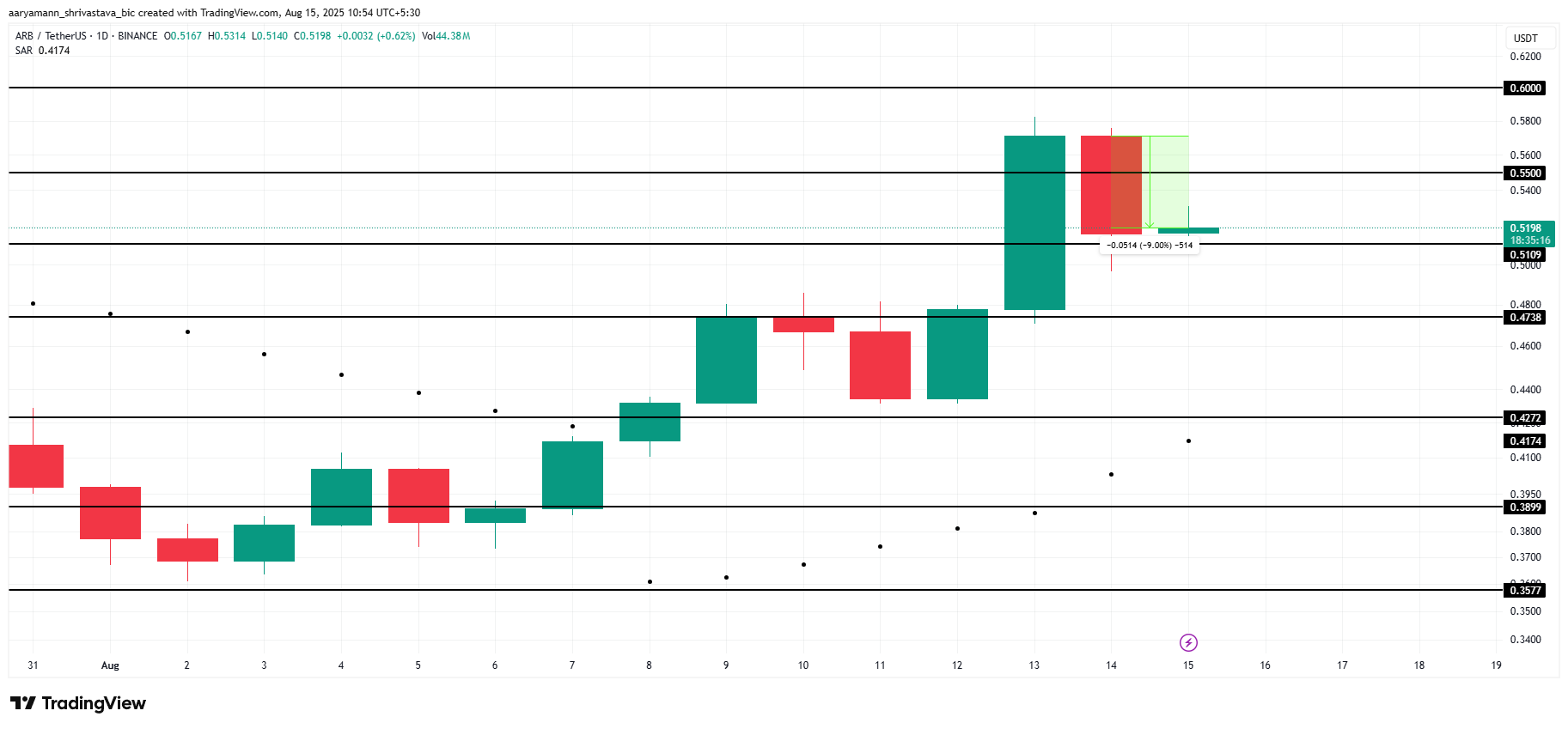 Осы демалыс күндері 92,65 млн ARB құрайтын, 48,22 млн доллардан астам құнға ие токеннің ашылуы жоспарланған. Ұсыныстың артуы бағаны төмендетуге қысым көрсетуі мүмкін. Алайда, Parabolic SAR индикаторы әлі де жоғары трендті көрсетіп, токеннің ашылуының теріс әсерлерін теңестіре алады.