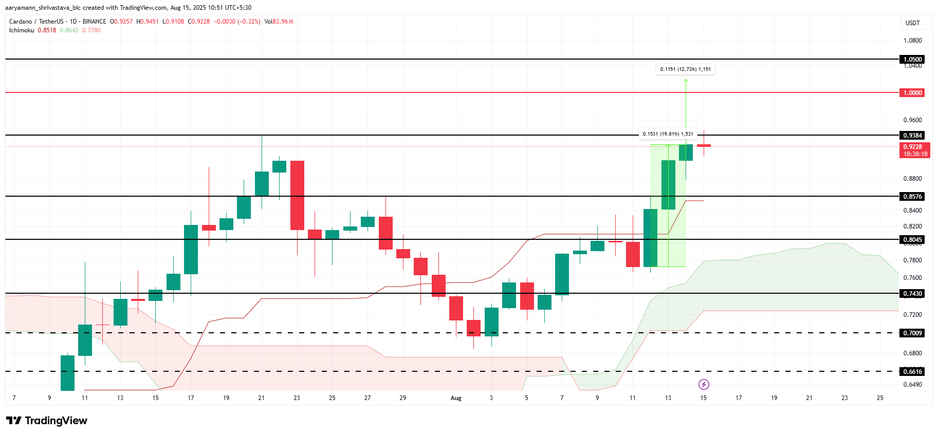Соңғы 24 сағат ішінде 12%-ға күндізгі өсім көрсеткеніне қарамастан, ADA аздап кері шегінді. Алайда, Ichimoku Cloud индикаторы бұқа импульсінің сақталғанын көрсетеді. Егер Cardano 0,92 долларды қолдауға айналдыра алса, бұл бағаны негізгі 1,00 доллар қарсылық деңгейіне қарай итермелеуге көмектесуі мүмкін.