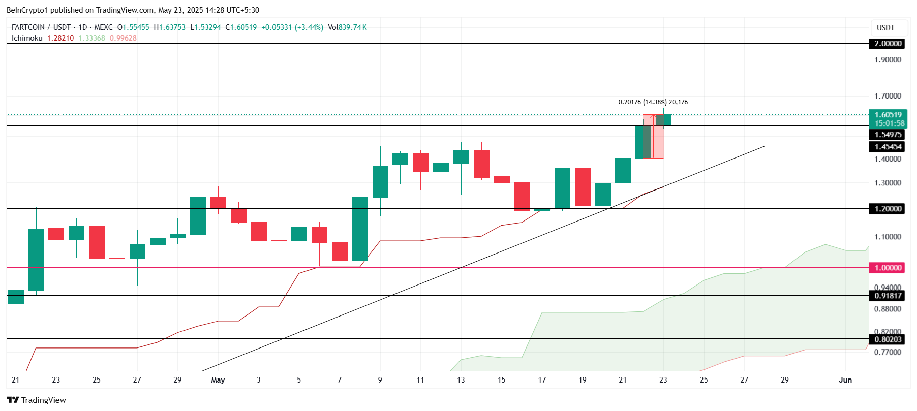 Қазіргі уақытта 1,60 долларға саудалануда, FARTCOIN 1,54 доллар қолдау деңгейін қамтамасыз етуге ұмтылуда. Шамдардың астындағы Ichimoku Cloud жоғары трендтің жалғасуын көрсетеді. Егер бұқа импульсі сақталса, альткоиннің келесі мақсаты 2,00 доллар болуы мүмкін, бұл оның нарықтағы позициясын нығайтады.