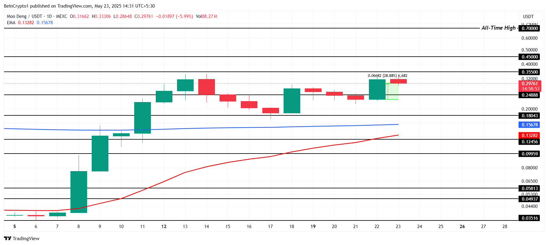 Бұл Алтын Крест бағаны жоғары көтеріп, соңғы 24 сағат ішінде байқалған 28%-дық өсуді жалғастыруы мүмкін. Егер MOODENG 0,355 доллар кедергісін бұзса, баға 0,450 долларға дейін көтерілуі мүмкін, альткоинді оның тарихи максимумы (ATH) 0,700 долларға жақындатып, инвесторлардың қызығушылығын арттырады.