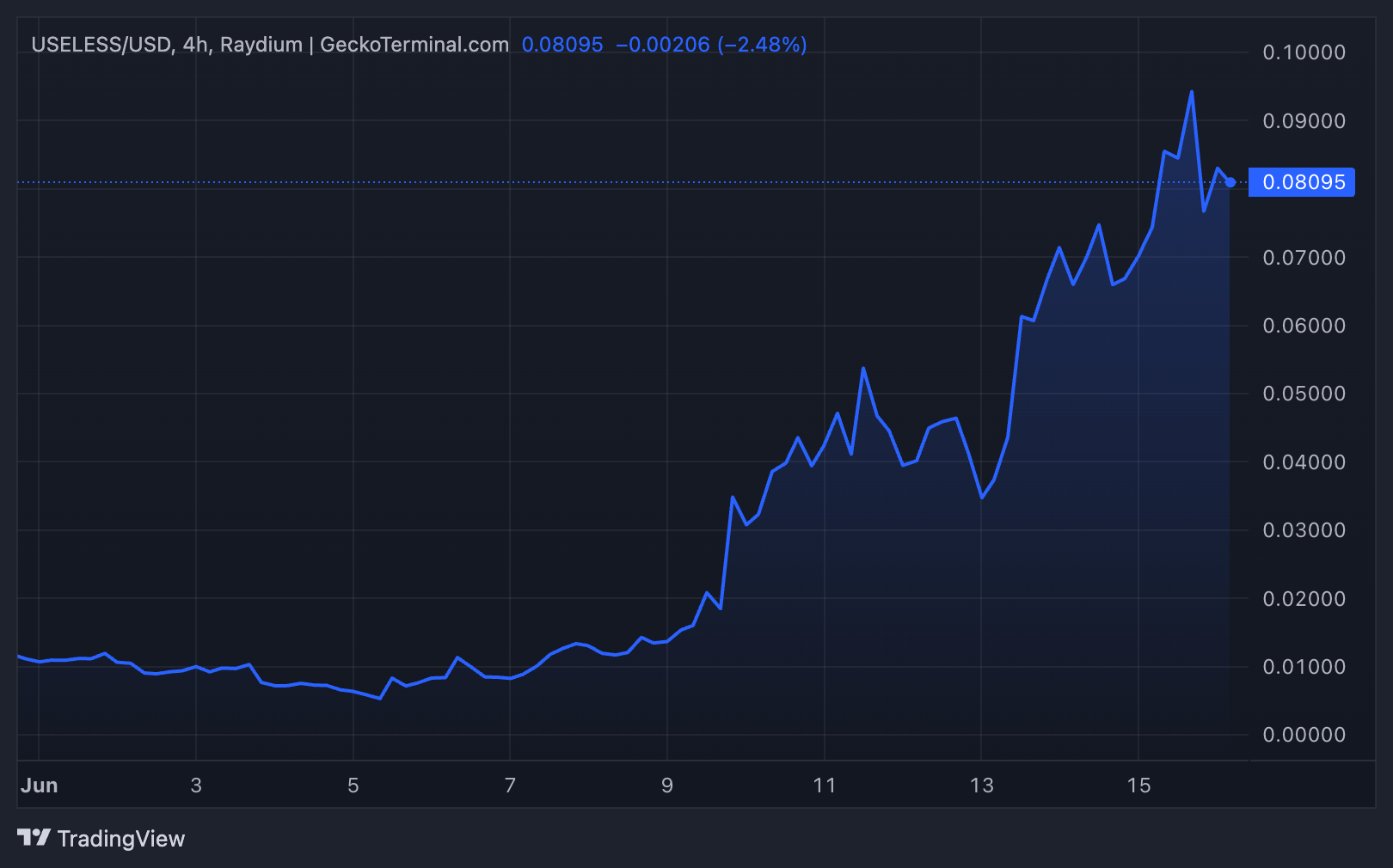 Маусым айының басында USELESS 0,004 доллар деңгейінде тарихи минимумға жетті. Алайда, монета тез қалпына келіп, айтарлықтай жоғары раллимен 0,10 доллар жаңа тарихи максимумға жетті. Бұл көтерілу оның нарықтық капитализациясын 101,9 млн долларға жеткізді.