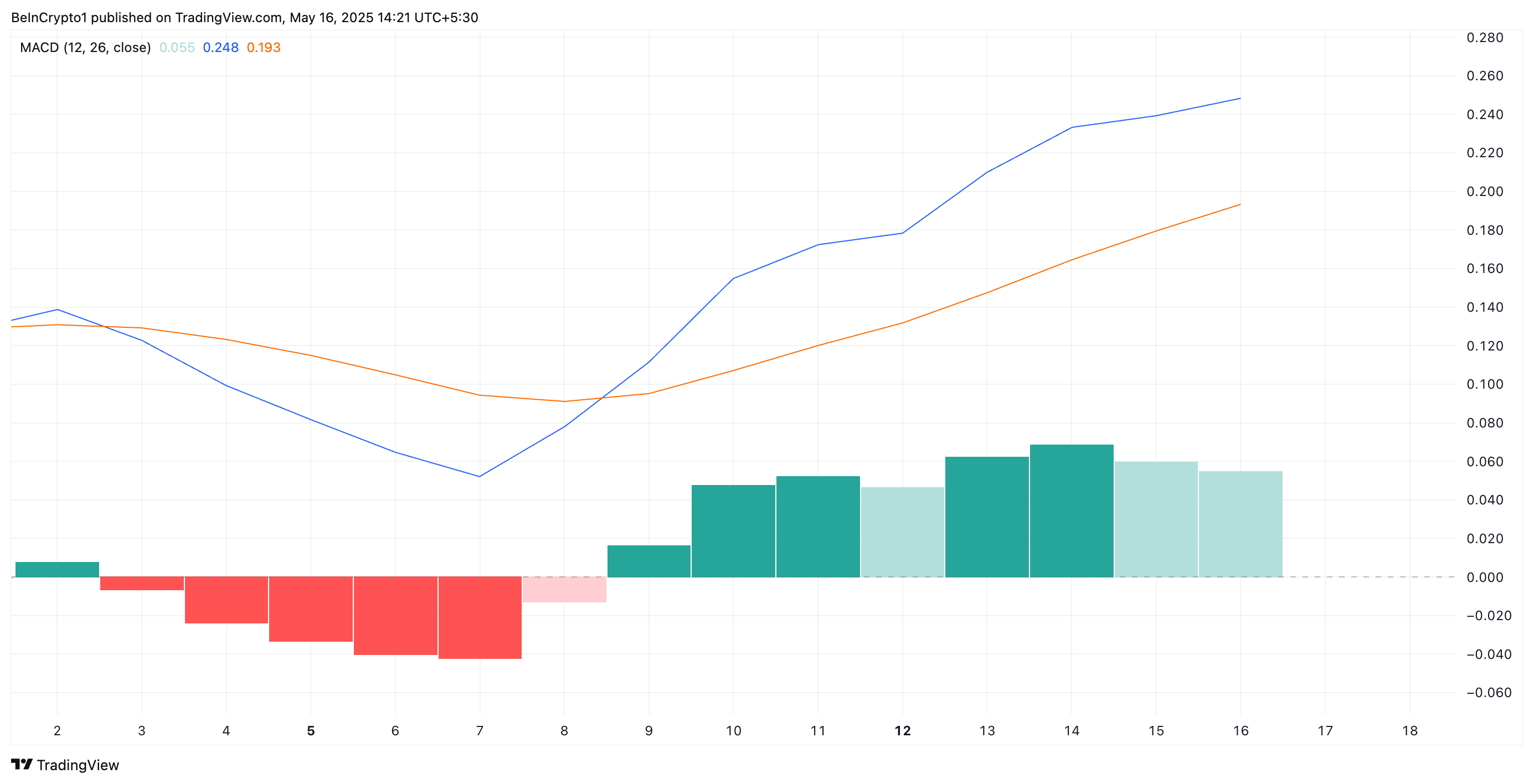 PENDLE жағдайында, MACD сызығы сигнал сызығынан жоғары орналасқанда, бұл бұқа сигналы болып табылады. Бұл трейдерлер арасында сатып алу белсенділігі сатылымнан асып түсетінін және бұқа жағдайлары сақталса, бағаның тұрақты раллиін білдіреді.