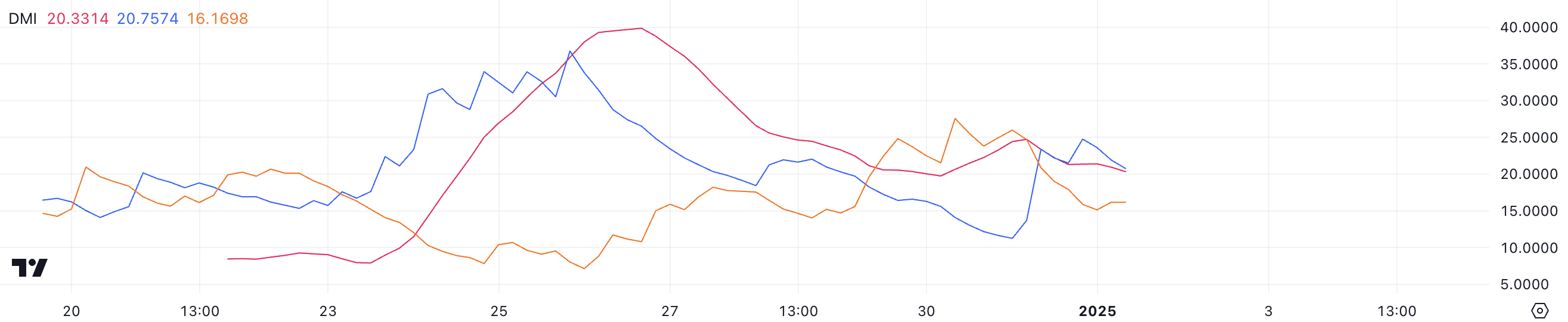 PENGU-дің DMI диаграммасы оның ADX қазіргі уақытта 20.3-де екенін көрсетеді, бұл бір күн бұрын жазылған 25 деңгейінен сәл төмен, бұл трендтің күшінің әлсірегенін көрсетеді. ADX-тің бұл төмендеуі жақында импульс болғанымен, нарық қазір бағыттық күштің азаю кезеңіне кіріп жатқанын көрсетеді.