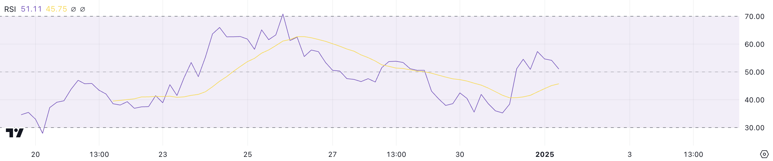 PENGU салыстырмалы күш индексі (RSI) қазіргі уақытта 51-де, бұл кешегі 57-ден аздап төмендегенін көрсетеді, бір күннен аз уақыт ішінде 35-тен көтерілгеннен кейін. Бұл қозғалыс сатып алу қысымы аздап төмендегенін көрсетсе де, RSI әлі де бейтарап аймақта екенін көрсетеді.