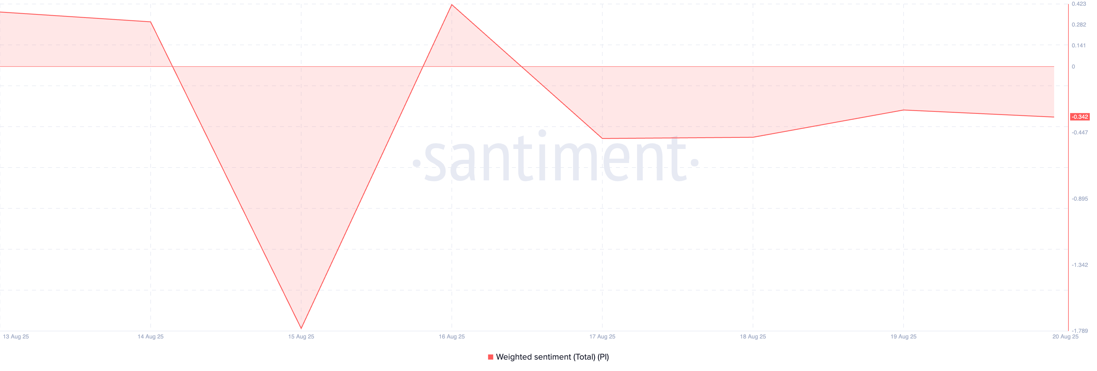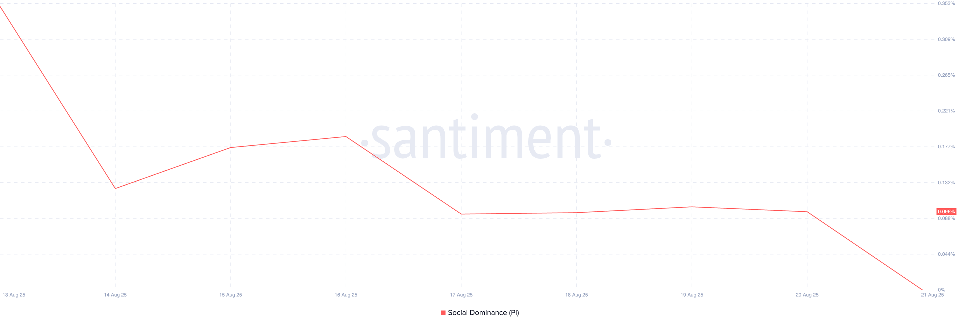 Santiment мәліметтері бойынша, PI-дің әлеуметтік үстемдігі апталық минимум 0,096%-ға дейін төмендеді, бұл шолу кезеңінде крипто талқылауларында альткоиннің маңыздылығының күрт төмендегенін көрсетеді.