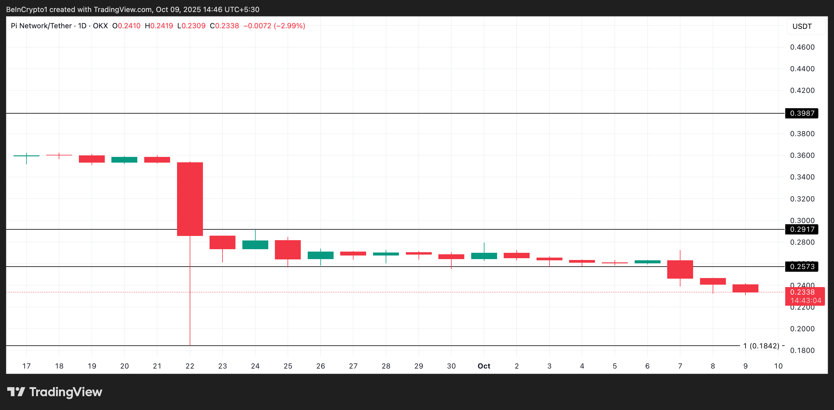 Pi Network-тің жергілікті токені Pi 23 қыркүйек пен 6 қазан аралығында бағасын тұрақты ұстап тұрған дағдарыстық қолдау деңгейінен төмен түсіп, елеулі құлдырауларды болдырмады.