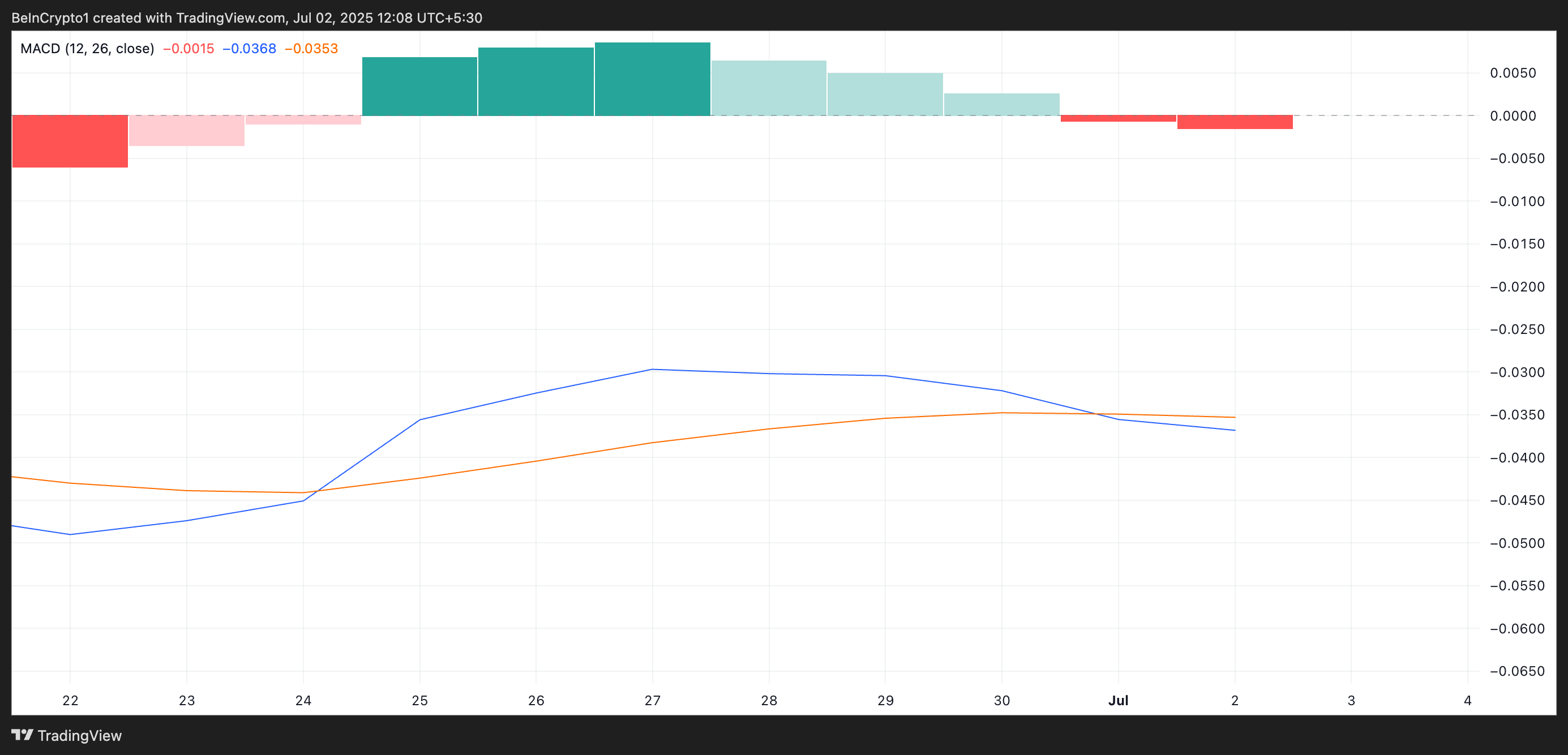 PI жағдайында, MACD сызығы сигнал сызығынан төмен түскенде, бұл өсіп келе жатқан аю импульсін және сатып алу күшінің әлсіреуін білдіреді. Трейдерлер бұл орнатуды сату сигналы ретінде түсіндіреді. Егер сату белсенділігі осының нәтижесінде күшейсе, бұл PI бағасына төмендеу қысымын күшейтуі мүмкін.