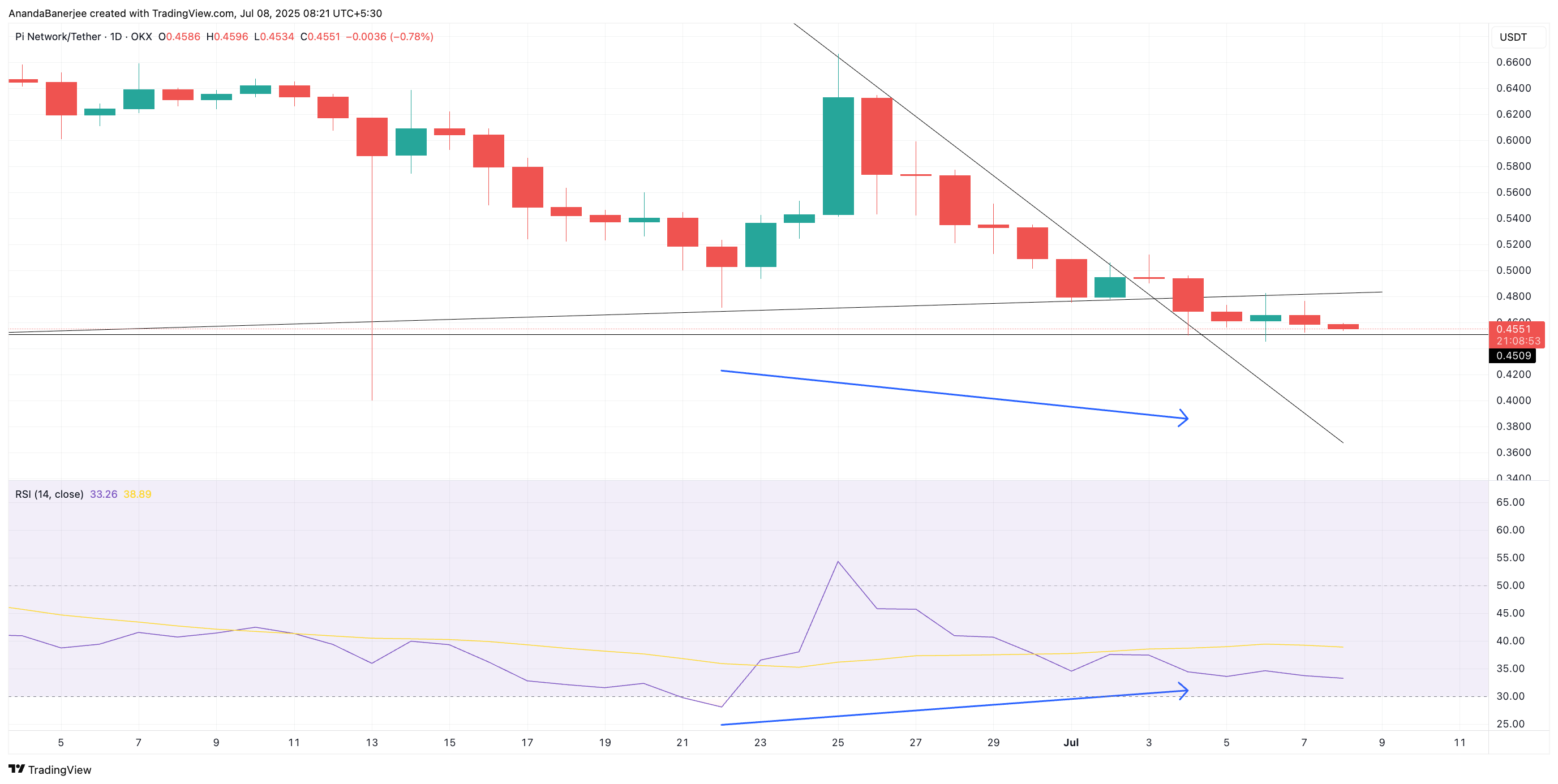 Pi коин құлдырап жатқандай көрінеді. Алайда, PI бағасы мен импульс арасындағы жасырын дивергенция керісінше көрсетеді.