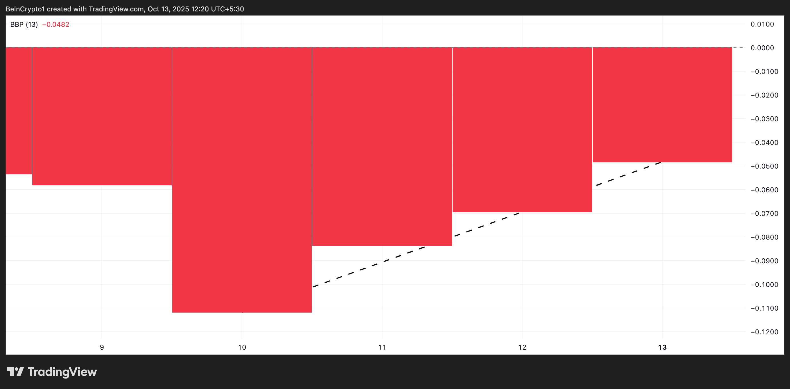 Elder-Ray индексі нарықтағы бұқалар мен аюлардың күшін өлшейді. Қызыл гистограмма жолақтары азая бастағанда, бұл аю импульсінің әлсіреп жатқанын және сатып алушылардың біртіндеп бақылауды қалпына келтіріп жатқанын көрсетеді.