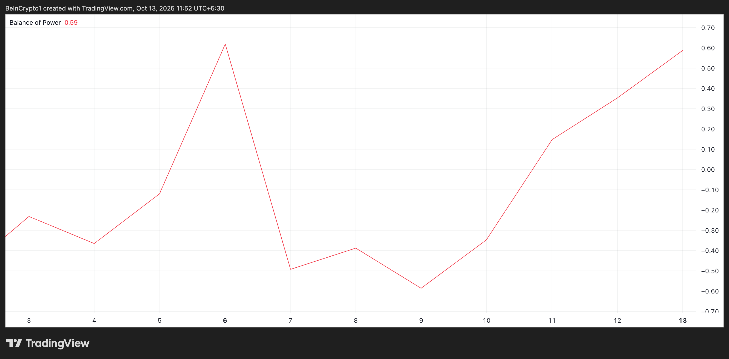 BoP индикаторы нарықтағы сатып алушылар мен сатушылардың күшін өлшейді. BoP көрсеткіштері -1 мен +1 аралығында болады, +1-ге жақын мәндер күшті сатып алу қысымын, ал -1-ге жақын мәндер күшті сату қысымын көрсетеді.