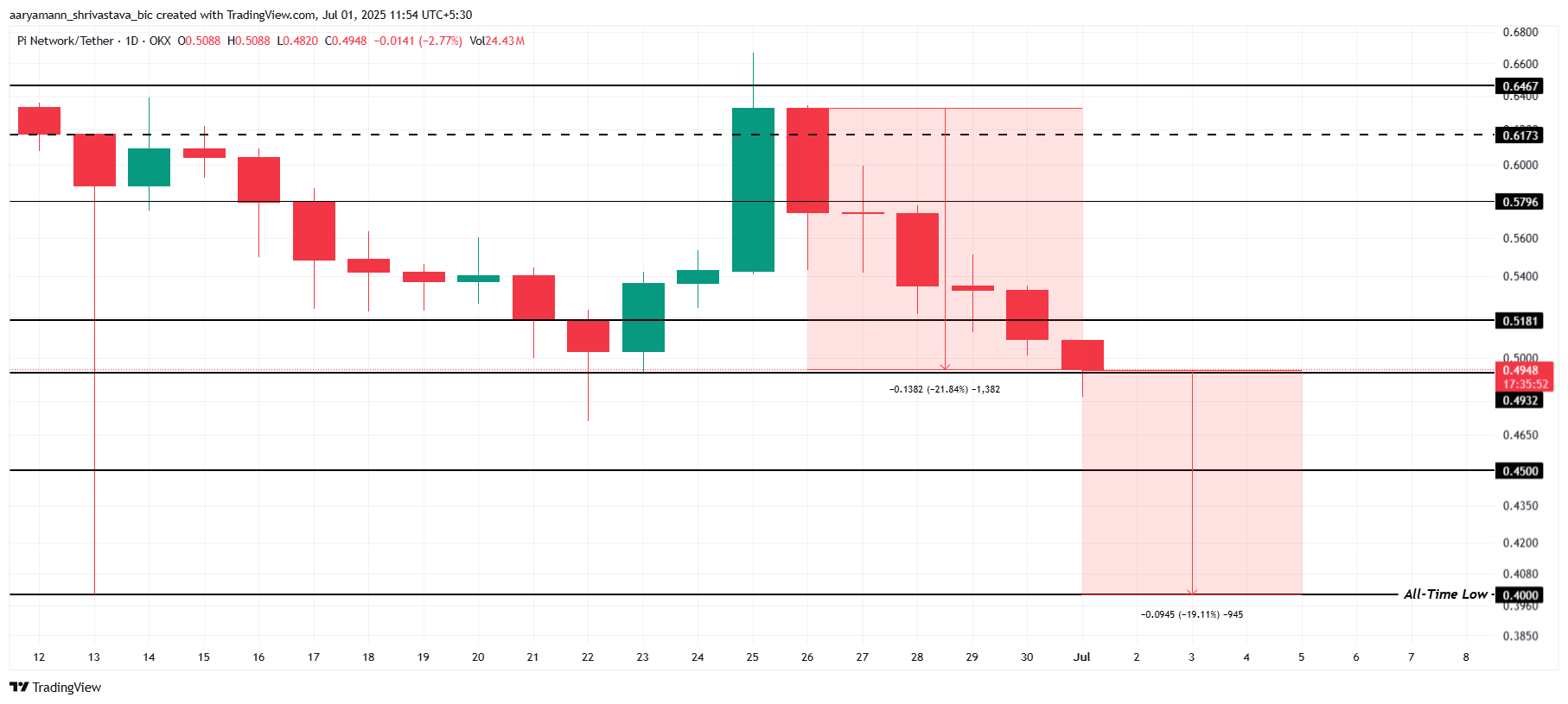 Орын алып жатқан факторларды ескере отырып, Pi Coin шілде айында түзетуге ұшырауы ықтимал. Альткоиннің барлық уақыттағы ең төменгі (ATL) деңгейі 0,40 доллар, қазіргі бағасынан 19%-ға алыс. Кез келген елеулі сату бағаны осы деңгейге қарай итермелеуі мүмкін. Егер баға 0,45 доллардан жоғары ұстай алмаса, Pi Coin одан әрі төмендеуді көре алады.