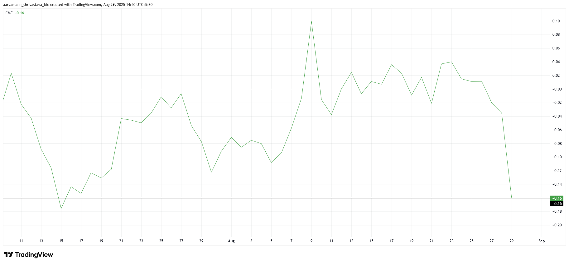 Chaikin Money Flow (CMF) қазіргі уақытта Pi Coin-нан айтарлықтай шығыстарды көрсетеді. Индикатор алты аптадағы ең төменгі нүктеге дейін төмендеді, бұл күшті сатылым қысымын көрсетеді. Инвесторлар активтен капиталды шығарып, оны дағдарыстық қолдау деңгейінде саудалап жатқанда, қалпына келу мүмкіндігін төмендетуде.