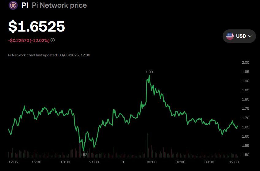 Pi Network-тің PI токені осы жазба кезінде 1,6525 доллар үшін сатылып, дүйсенбі сессиясы ашылғаннан бері 12%-дан астам төмендеді.