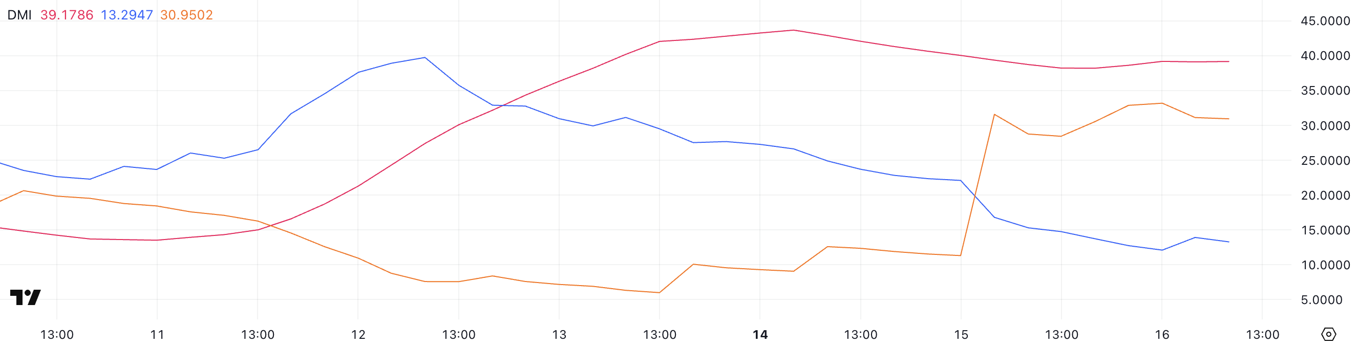 +DI бұқа күшін, ал -DI аю күшін білдіреді — сондықтан бұл қиылысу және алшақтықтың кеңеюі сатушылардың қазір бақылауда екенін растайды. Бұл орнату әдетте төмендеуді жалғастыруды көрсетеді, әсіресе -DI басым болып, ADX тұрақтанып немесе қайта көтерілсе, аю трендінің күшейгенін білдіреді.