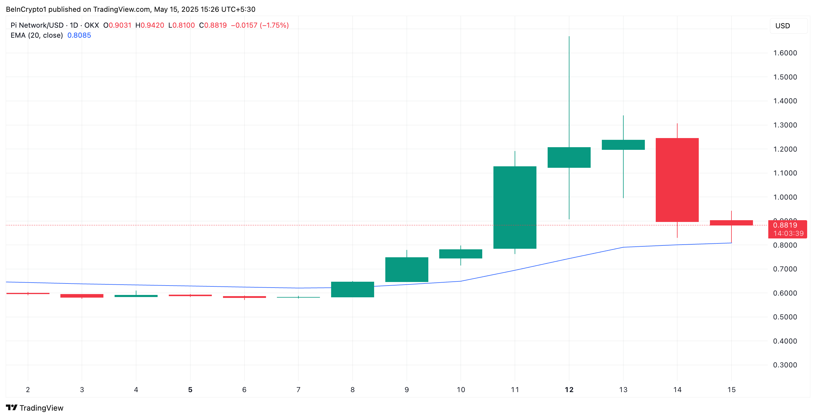PI/USD бір күндік график көрсеткіштері бұл құлдырау әлі аяқталмағанын меңзейді. Жазу кезінде PI бағасы 20 күндік экспоненциалды жылжымалы орташа мәнінен (EMA) төмен түсуге жақын, бұл тұрақты аю трендінің көрсеткіші.