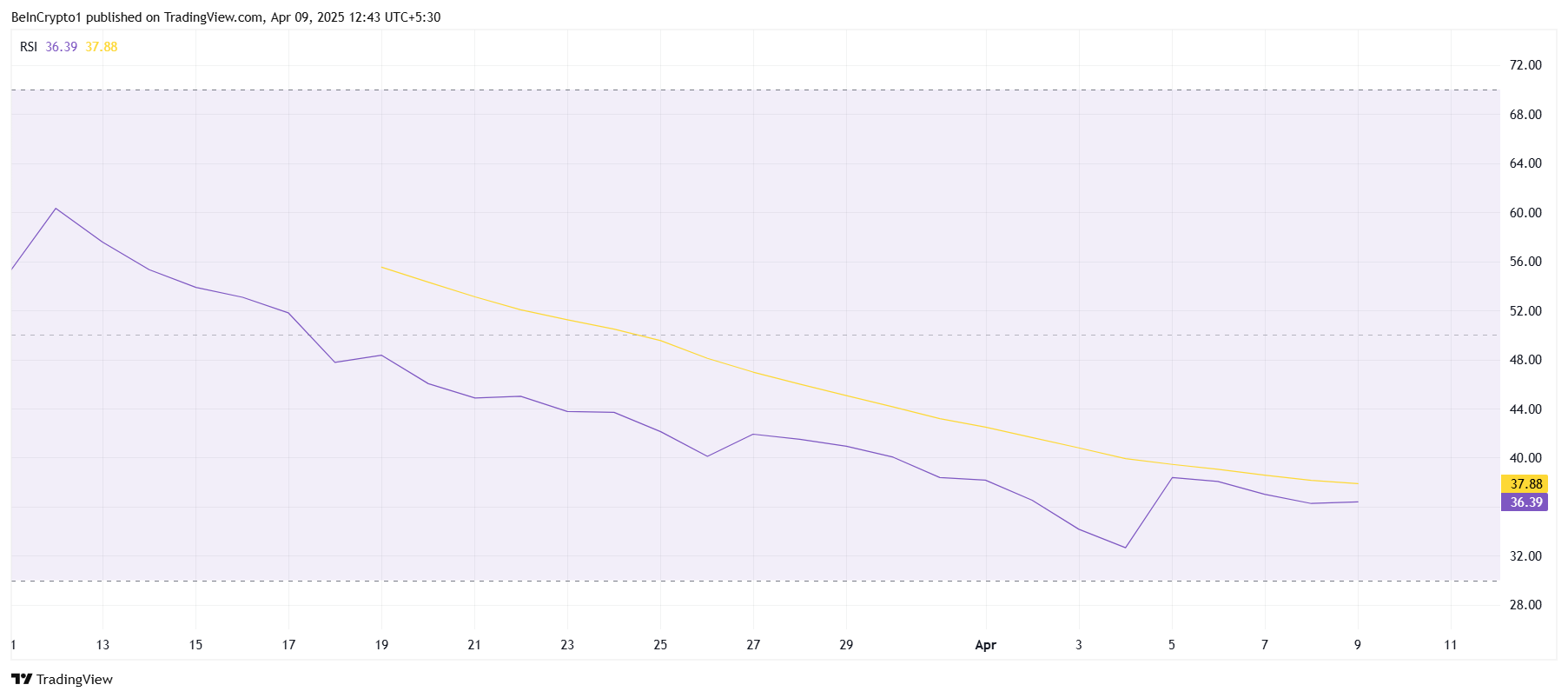 Pi Network-тің жалпы макро импульсі қиындықтарға тап болуда. Салыстырмалы күш индексі (RSI) үш аптадан астам уақыт бойы аюлы аймақта қалды. Қазіргі уақытта RSI бейтарап 50,0 деңгейінен алыс, бұл Pi нарығы әлі де қысым астында екенін және кері бұрылудың жақын арада белгісі жоқ екенін көрсетеді.