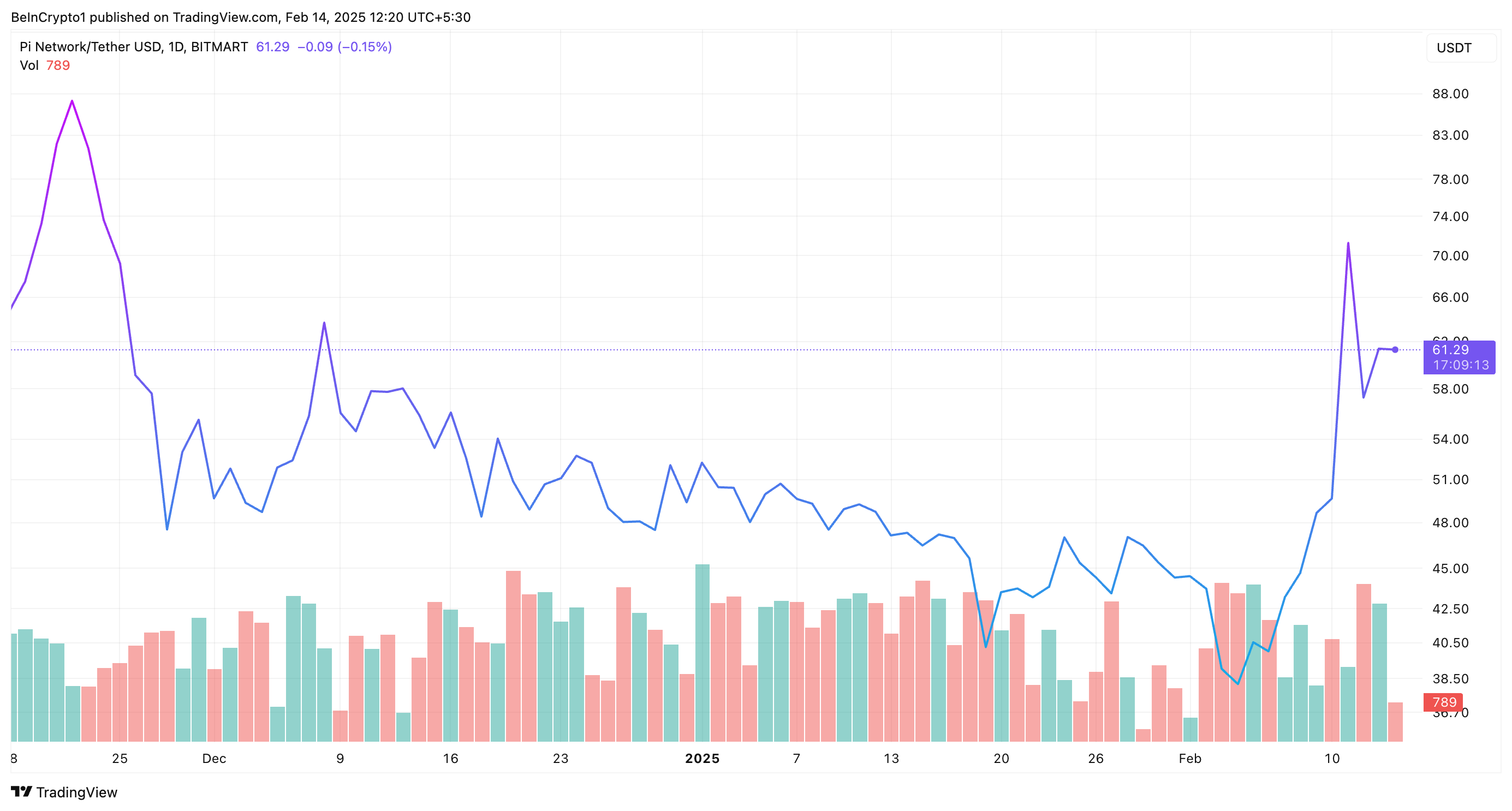 Дегенмен, импульс сәл бәсеңдеді. Жазу кезінде ол 61,2 доллардан саудалануда. BeInCrypto талдауына сәйкес, Pi токенінің іске қосылу кезіндегі күтілетін баға диапазоны 40,8 доллар мен 68,7 доллар арасында.