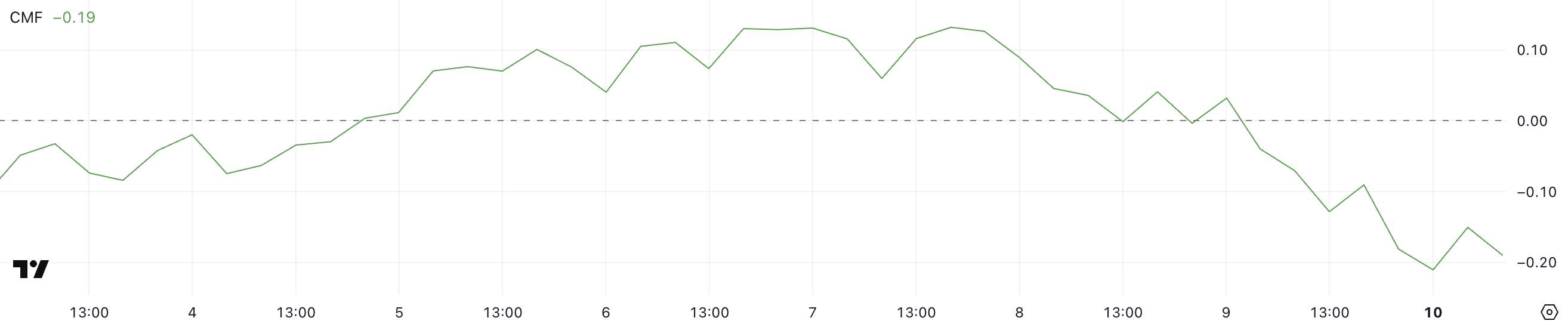 CMF активке ақша ағынының көлеммен өлшенген ағынын өлшейтін индикатор, -1-ден 1-ге дейінгі диапазонда. Оң мәндер сатып алу қысымын көрсетеді, ал теріс мәндер сатудың артуын білдіреді.