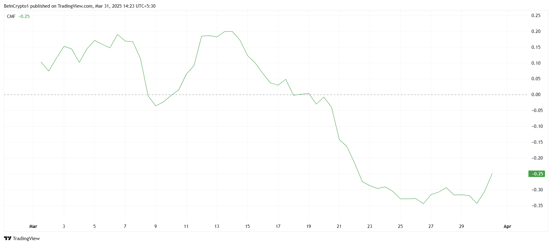 Pi Network макро импульсі де альткоин үшін көңілсіз көрініс береді. Чайкин ақша ағыны (CMF) индикаторы, монетаға кіретін және шығатын ақша көлемін өлшейтін, терең теріс аймақта. Аздап өсу байқалғанымен, индикатор теріс аймақта қалып отыр, бұл инвесторлардың токенді сатып алуға әлі де құлықсыз екенін көрсетеді.